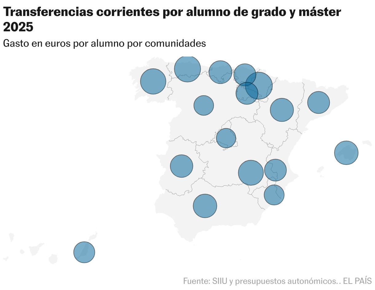 Madrid, la región más rica de España, se esfuerza en repetir que financia como nadie de bien a sus universidades y, sin embargo, un análisis de este diario de las transferencias corrientes para los campus públicos españoles en 2025 demuestra lo contrario: vuelve a estar a la cola, con una inversión por alumno de 5.467 euros. Esta cifra es el resultado de la división de esta partida ―que se emplea en pagar las nóminas y los gastos de cada día― entre el número de estudiantes de grado y máster el curso pasado (últimos datos). Y eso que el Gobierno de Isabel Díaz Ayuso (PP) pretendió subir la cuantía en 2025 un 0,9% y, al final, ha sido del 4,2% (43,7 millones), por las enormes presiones de los rectores.