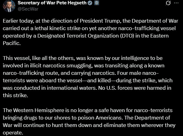 El funcionario concluyó con una advertencia, afirmando que «el hemisferio occidental ya no es un refugio seguro para los narcoterroristas que introducen drogas en nuestras costas para envenenar a los estadounidenses». Aseguró que el Departamento de Guerra «continuará persiguiéndolos y eliminándolos dondequiera que operen».