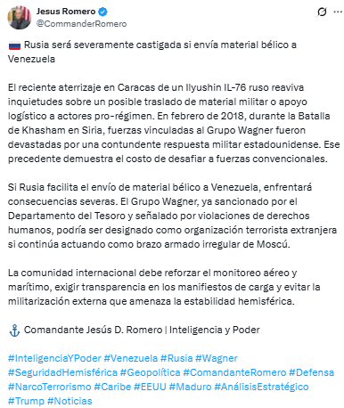 El excomandante de inteligencia naval de Estados Unidos, Jesús D. Romero, emitió una contundente advertencia a Rusia, asegurando que enfrentará «consecuencias severas» si se confirma el traslado de material bélico a Venezuela, tras el reciente aterrizaje de un avión de carga ruso Ilyushin IL-76 en Caracas.