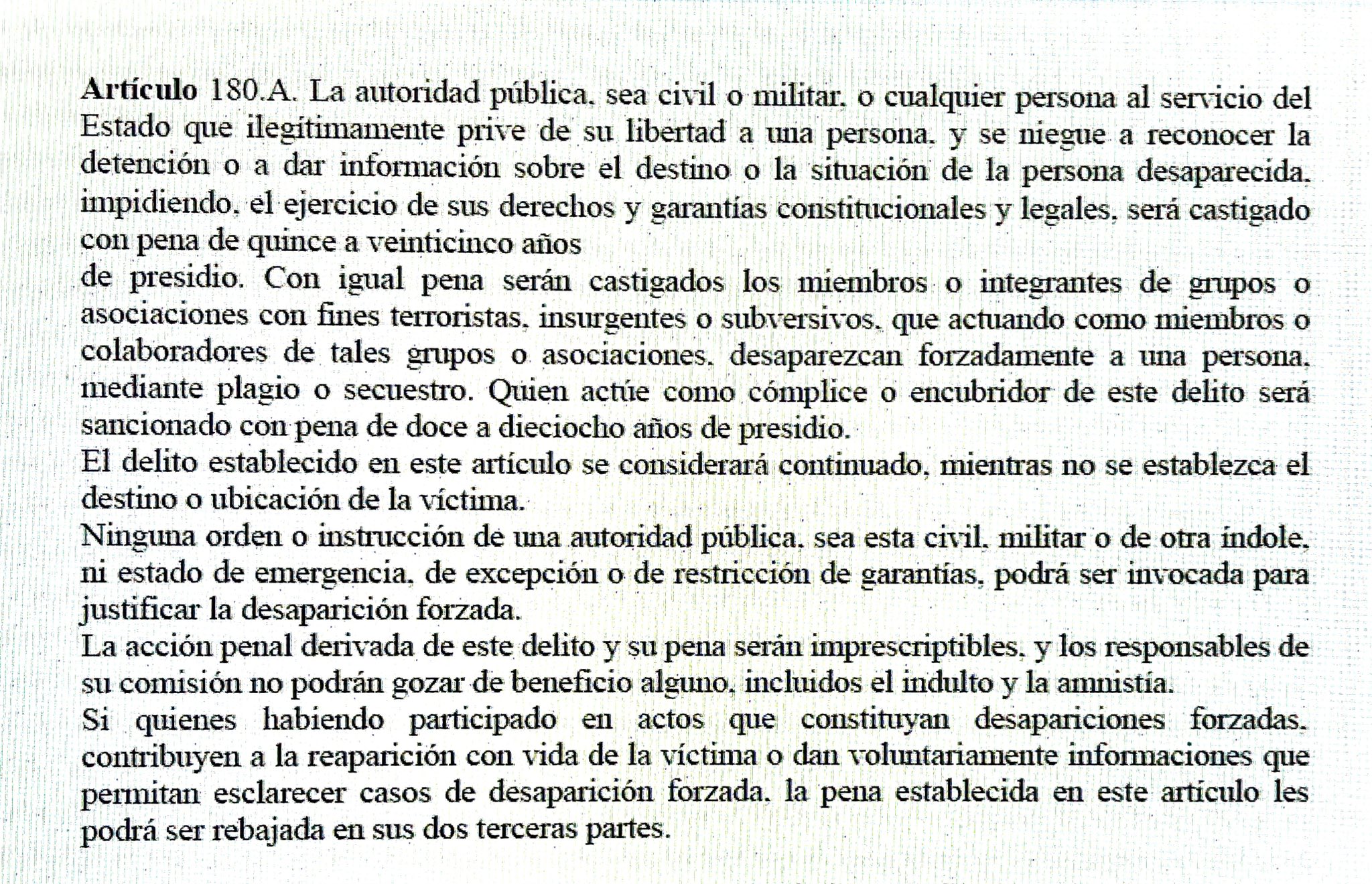 La publicación incluye una imagen del texto completo del artículo 180-A, que establece sanciones para cualquier funcionario —civil o militar— que prive de libertad a un ciudadano y se niegue a reconocer su detención o informar sobre su ubicación. El artículo también aclara que ninguna orden superior puede justificar este delito.