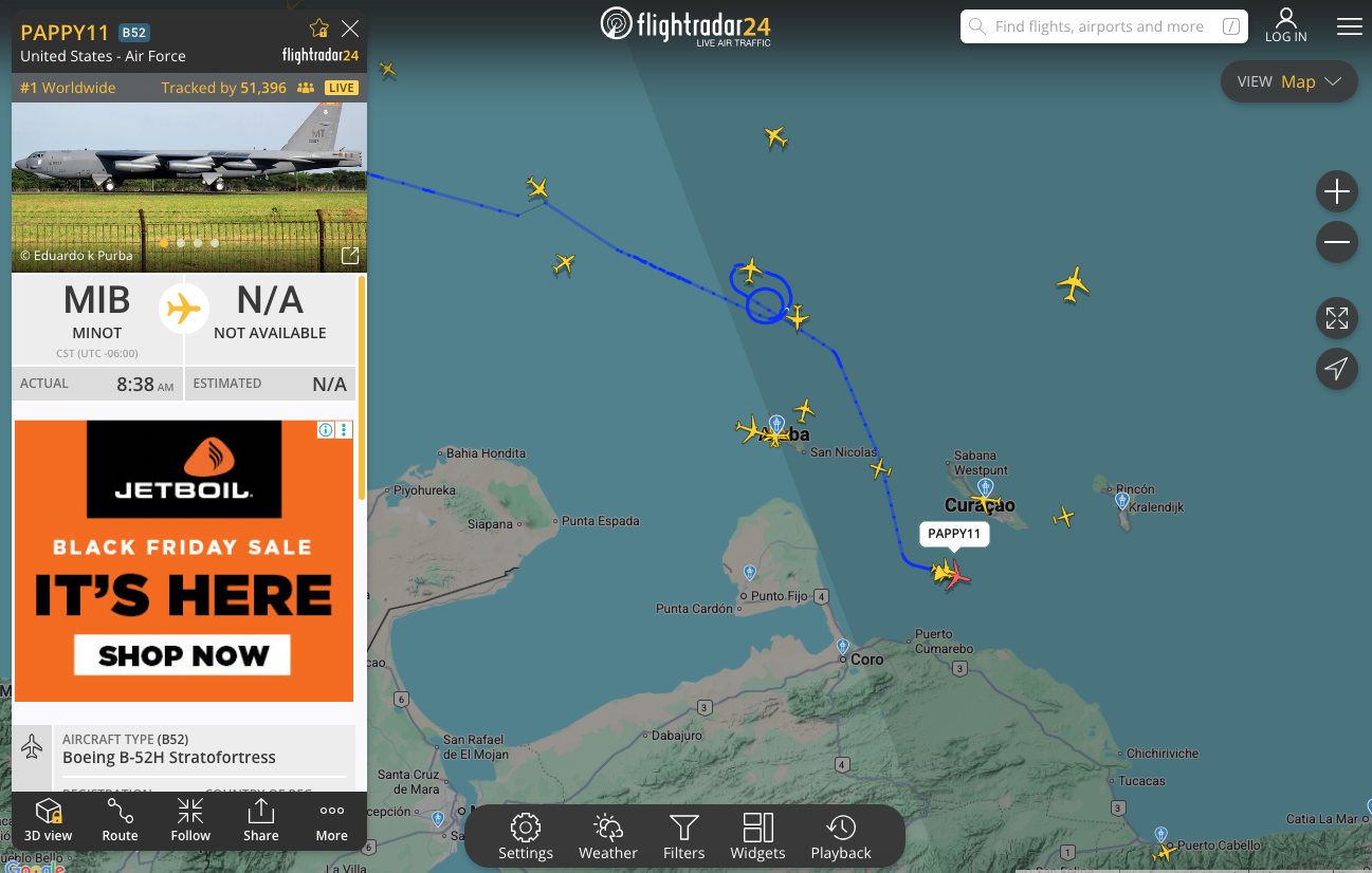Uno de los bombarderos Boeing B-52H Stratofortress, que salió la mañana de este lunes de la Base Aérea Minot, en Dakota del Norte, llegó cerca de Aruba a las 6:05 pm, frente a la Península de Paraguaná, en Venezuela, luego de un largo viaje en el que pasó por Nueva Orleans y Cancún. Frente a esas costas hizo varios giros y se mantuvo sobrevolando la zona por más de media hora. Luego se dirigió cerca de Puerto Cumarebo, en el estado Falcón, según los registros de flightradar24, para luego acercarse a Caracas.
