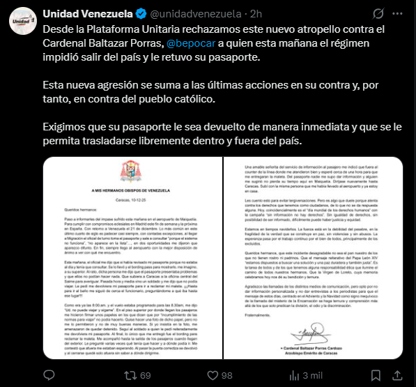 La oposición mayoritaria de Venezuela, agrupada en la Plataforma Unitaria Democrática (PUD), rechazó este miércoles 10 de diciembre la que tachó como «agresión» contra el cardenal Baltazar Porras, cuyo pasaporte fue «anulado» por funcionarios del chavismo, cuando intentaba viajar desde el Aeropuerto de Maiquetía, que sirve a Caracas, con rumbo a Colombia y con destino final a España.
