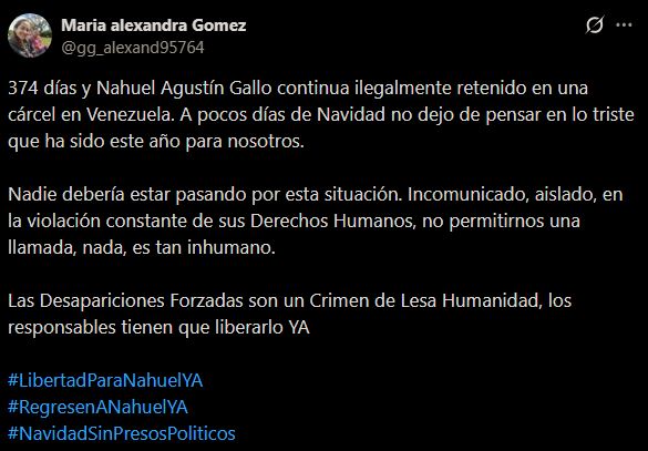 El drama de la familia del gendarme argentino Nahuel Agustín Gallo sumó un nuevo y doloroso capítulo. Su esposa, María Alexandra Gómez, denunció que este miércoles se cumplen 374 días de la detención arbitraria de su pareja en una cárcel de Venezuela.