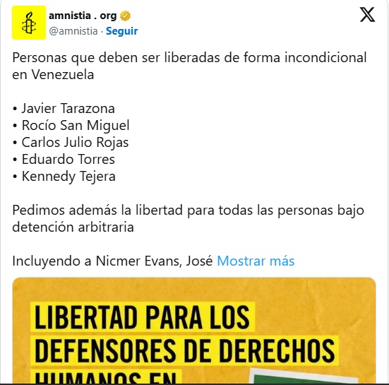 La organización global Amnistía Internacional exigió a la administración de Nicolás Maduro la liberación incondicional de un grupo de defensores de derechos humanos y comunicadores. La petición destaca los casos de Javier Tarazona, Rocío San Miguel, Carlos Julio Rojas, Eduardo Torres y Kennedy Tejera, señalando que su reclusión responde a detenciones arbitrarias.