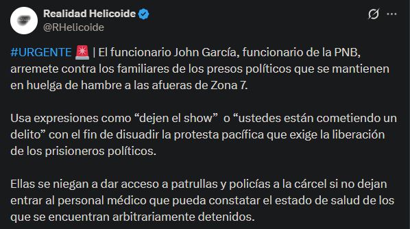 A través de un video compartido en X por Realidad Helicoide, el uniformado, identificado como John García, utilizó expresiones como “dejen el show” y acusó a los familiares de “cometer un delito” por mantenerse firmes y no permitir el ingreso de efectivos hasta que se constate la salud de sus seres queridos .
