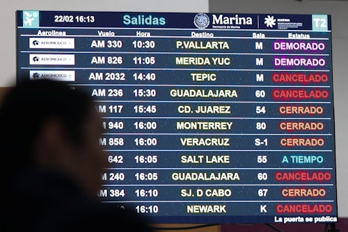 Una pantalla muestra vuelos cancelados a Guadalajara y Tepic en el Aeropuerto Internacional Benito Juárez luego de que las autoridades reforzaron la seguridad tras bloqueos de carreteras y ataques incendiarios perpetrados por el crimen organizado en varios estados, tras un operativo militar en el que, según una fuente gubernamental, el narcotraficante mexicano Nemesio Oseguera, conocido como «El Mencho», fue asesinado en el estado de Jalisco, en la Ciudad de México, México, el 22 de febrero de 2026. Reuters/Luis Cortés.